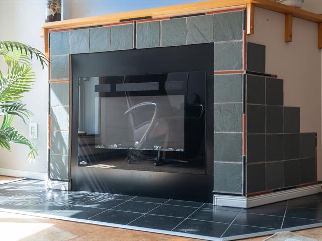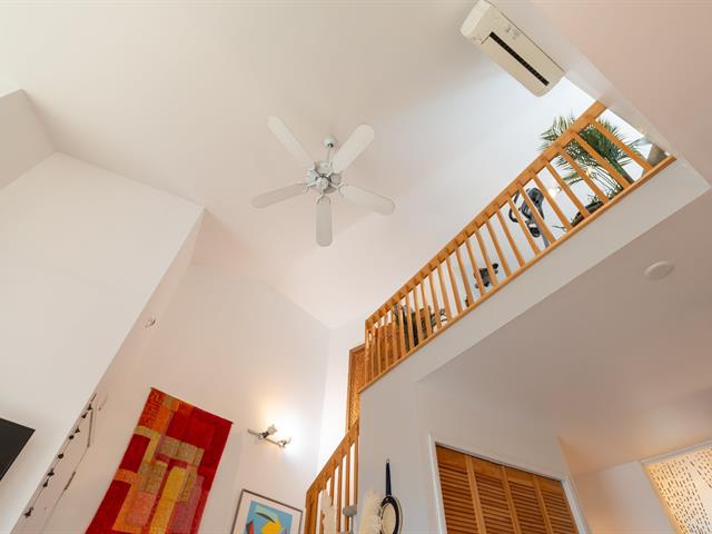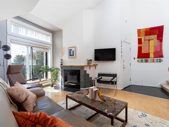 Bright and spacious 1,220 sq. ft. condo with cathedral ceilings, 2 closed bedrooms, and a versatile mezzanine with large storage. Private terrace with stunning views of the Rivière des Prairies and surrounding greenery. Practical kitchen with ample cabinets and large counter, all appliances included. Electric fireplace, wall-mounted A/C, and quality electric baseboards. Includes indoor garage and large storage with 110V outlet, perfect for EV charging. Well-managed condo with affordable fees and taxes. Waterfront complex with bike paths, parks, and quick access to Pie-IX Bridge. Bikes storage. Quick occupancy available.
