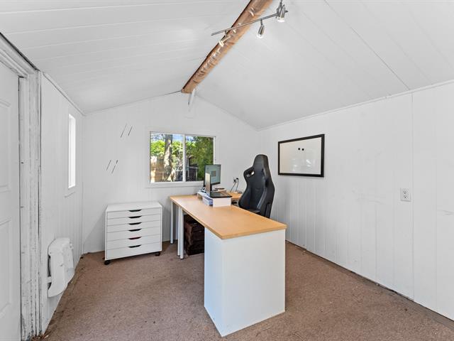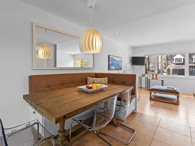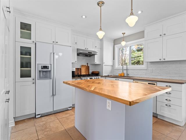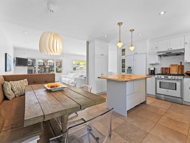 On the main floor, you'll be welcomed by a spacious, bright entryway that opens onto the main living area. The living room, bathed in natural light thanks to generous windows, offers a welcoming living space. The kitchen, renovated in 2011, blends warmth and modernity with its white shaker cabinets, elegant countertops, central island, refined backsplash and gas range -- the perfect place to cook, entertain and share precious family moments. The adjacent dining nook, with built-in banquette, opens to the backyard through a patio door.