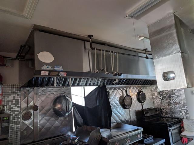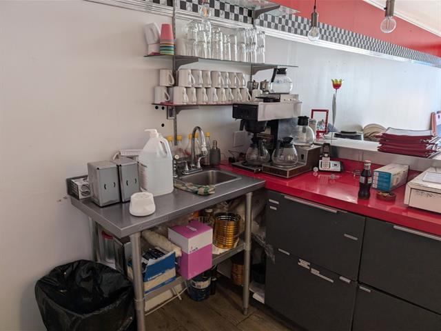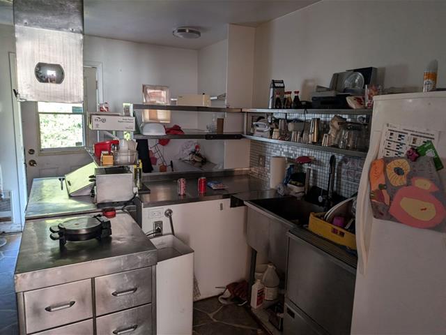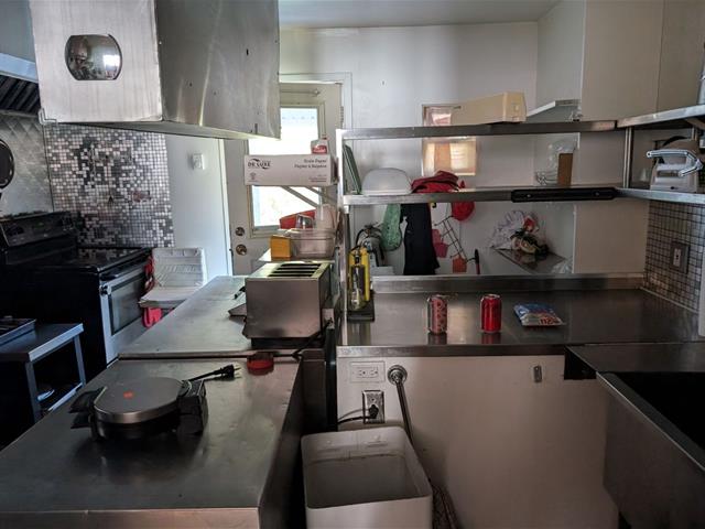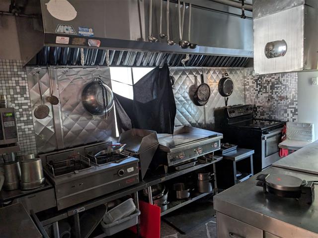 Light fixtures, stove with hood and countertop all commercial, wall-mounted heat pump.