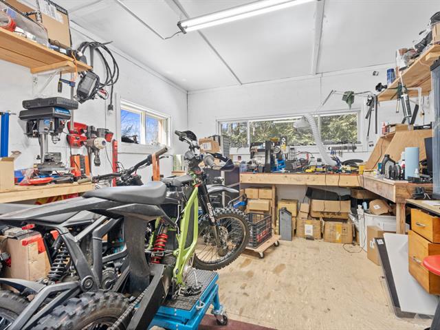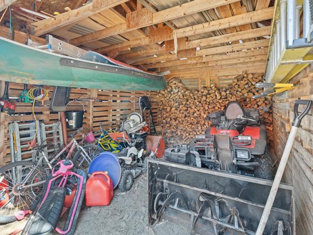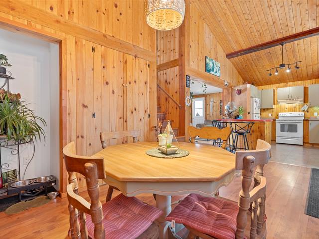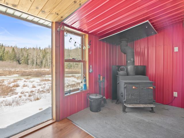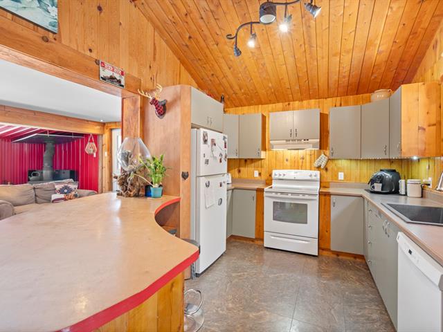L'intérieur séduit par sa grande aire ouverte lumineuse, créant une ambiance conviviale et chaleureuse. La cuisine, rare pour un chalet de cette taille, offre un bel espace de travail et de rangement. Le poêle au bois ajoute une touche authentique et un confort apprécié en toute saison.