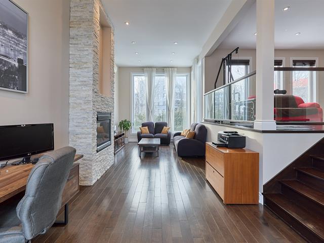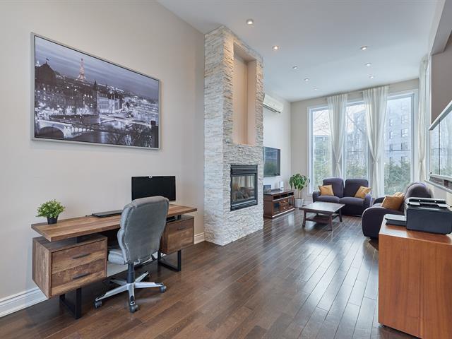 Le salon, vaste et lumineux, est agrémenté d'un foyer au gaz, créant une atmosphère chaleureuse et conviviale, et comprend également un espace bureau soigneusement aménagé.
