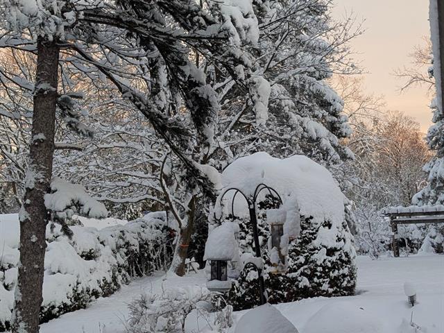 Laveuse-sécheuse LG (2025, garantie) · Cuisinière gaz/four électrique Wolf (2011) · 2 réfrigérateurs Fisher & Paykel (2022) · Hotte Zephyr (2023) · Aspirateur central Thomson-vac (2023) ·Foyer au gaz Mendota (2011) · Lampadaire 5 branches (2013) · Barbecue Weber (2011) · 3 auvents rétractables Somfy (2 jardin, 1 chambre) · Habillage complet des fenêtres (stores et rideaux de soie) · Lumières encastrées et plafonniers · Système d'osmose inversée + filtres · Bibliothèques et étagères encastrée