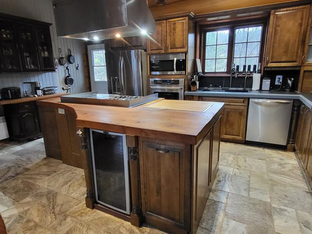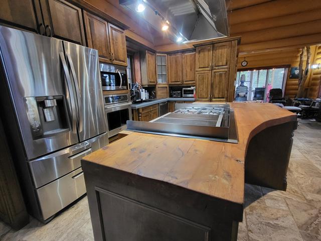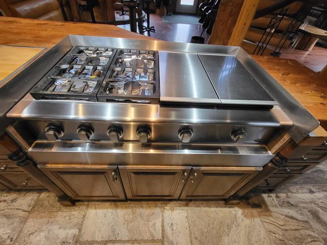 Cuisine de chef avec hotte en stainless au-dessus de l'îlot