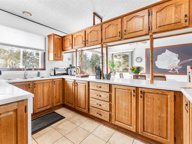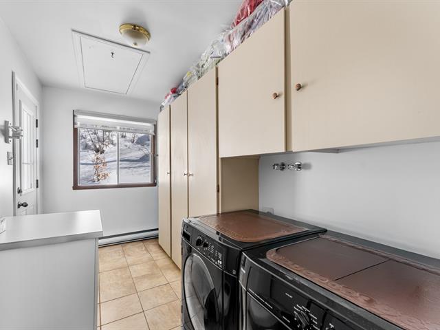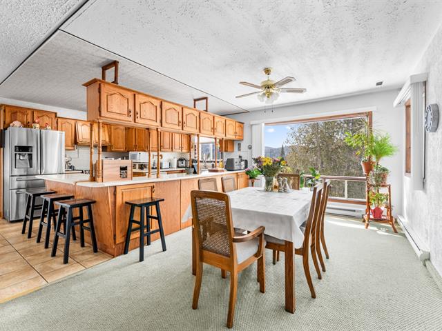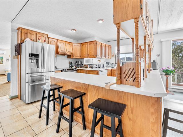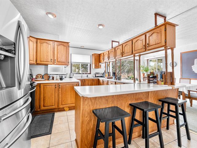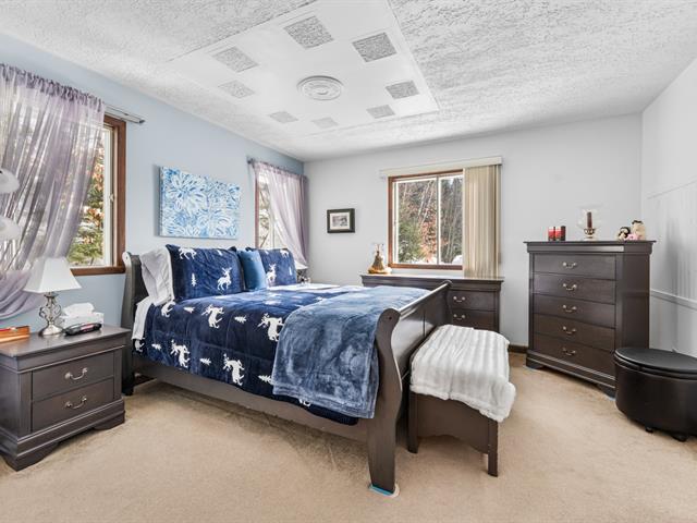 Au rez-de-chaussée, le grand salon avec foyer au bois invite à la détente. La salle à manger s'harmonise parfaitement à la cuisine munie d'armoires en bois, d'un généreux espace de rangement et d'un vaste plan de travail, idéal pour recevoir. La chambre principale, de belles dimensions, propose un foyer et un accès direct à la salle de bain équipée de deux lavabos. Deux autres chambres complètent ce niveau, un atout recherché.