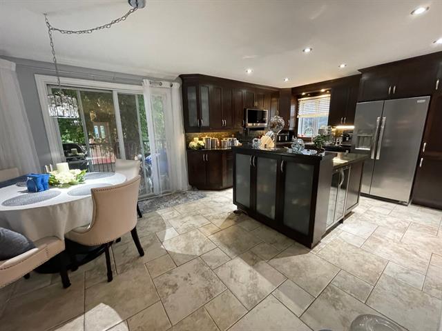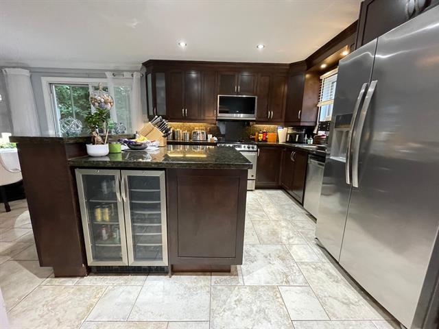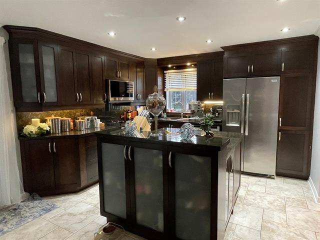 - Sa cuisine haut de gamme est composée de portes d'armoires en polyester avec comptoirs et dosserait en granite et d'un îlot central de 10 pieds avec comptoir-lunch, ainsi qu'un coin dinette.
